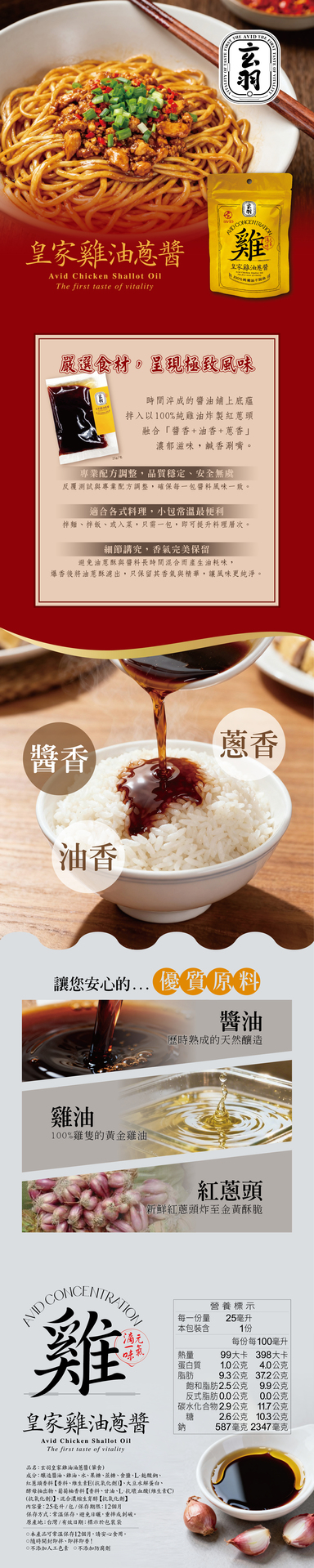 玄羽「皇家雞油蔥醬」採用100%雞隻黃金雞油,搭配手工慢炸紅蔥酥與天然釀造醬油,風味醇厚,完美融合「醬香 × 油香 × 蔥香」,不含防腐劑、人工色素,是你廚房中不可或缺的靈魂調味。