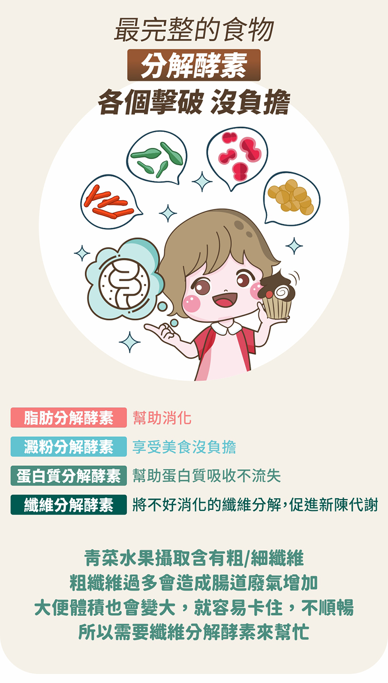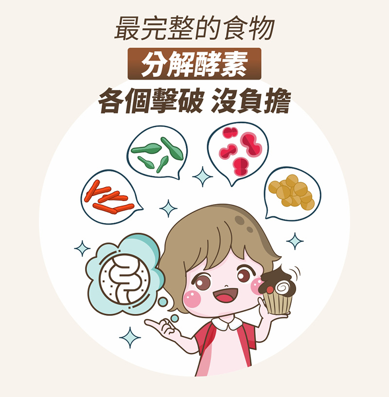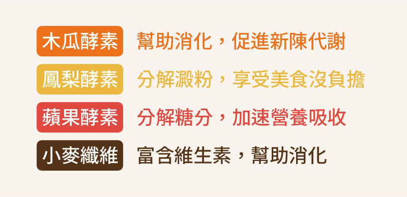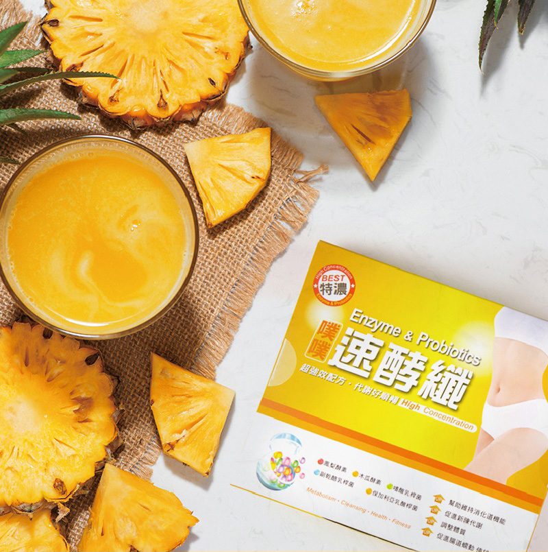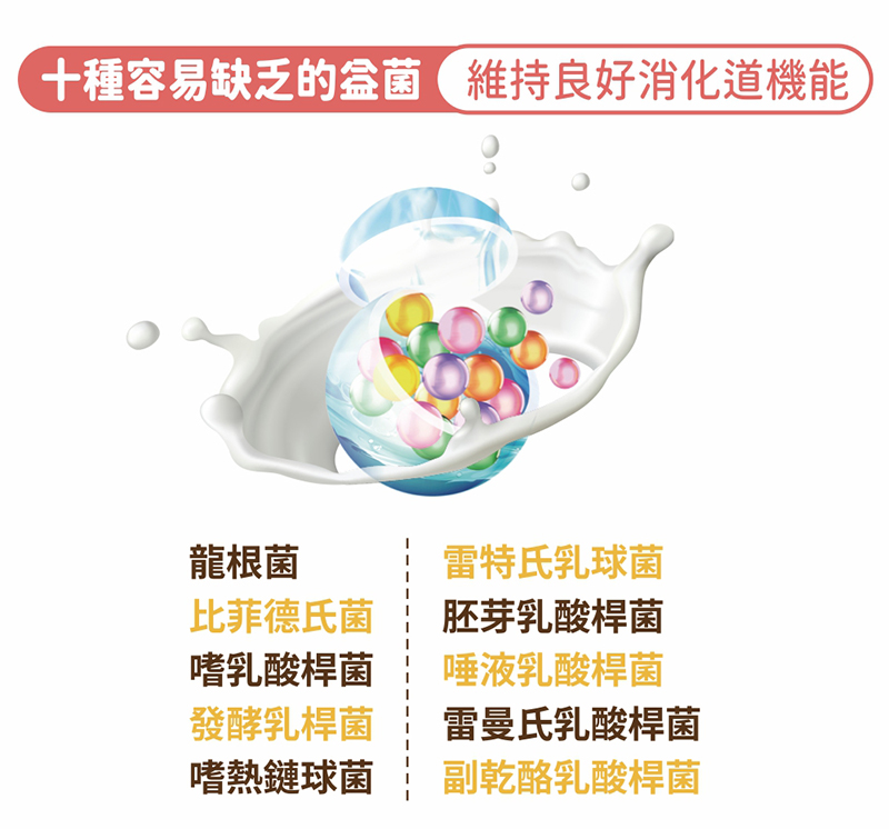 乳糖、果寡糖、植物綜合酵素(麥芽糊精、澱粉分解酵素、蛋白分解酵素、脂肪分解酵素、纖維分解酵素、鳳梨果實、胡蘿蔔、薏苡仁、芡實、紫菜)、鳳梨果汁粉(鳳梨濃縮汁、麥芽糊精、檸檬酸、香料)、海洋鎂(天然海水礦物質提取)、十益菌(雷曼氏乳酸桿菌、副乾酪乳酸桿菌、胚芽乳酸桿菌、嗜乳酸桿菌、唾液乳酸桿菌、龍根菌、發酵乳桿菌、嗜熱鏈球菌、雷特氏乳球菌、比菲德氏菌、脫脂奶粉)。