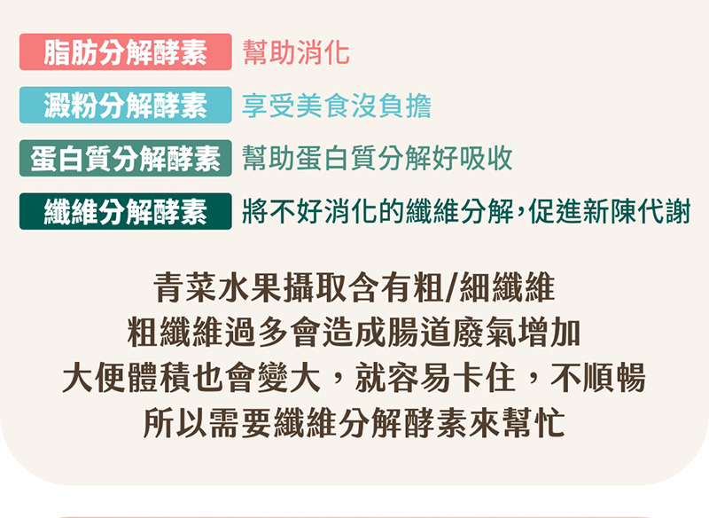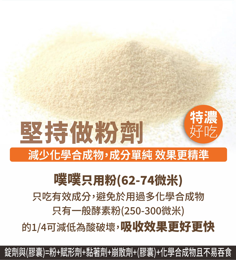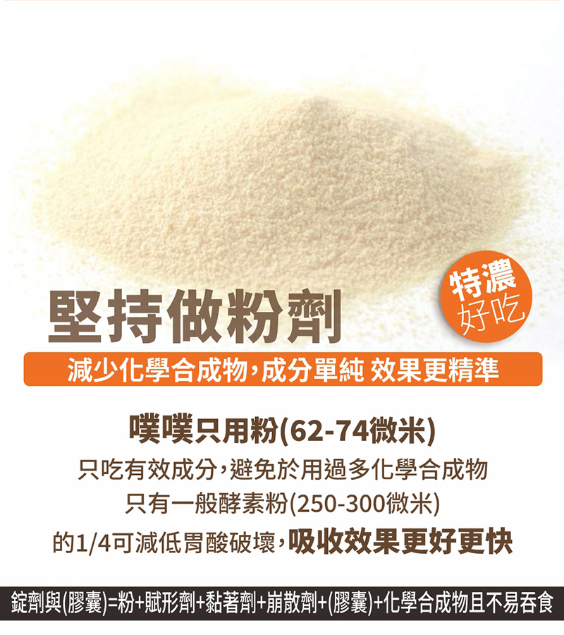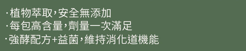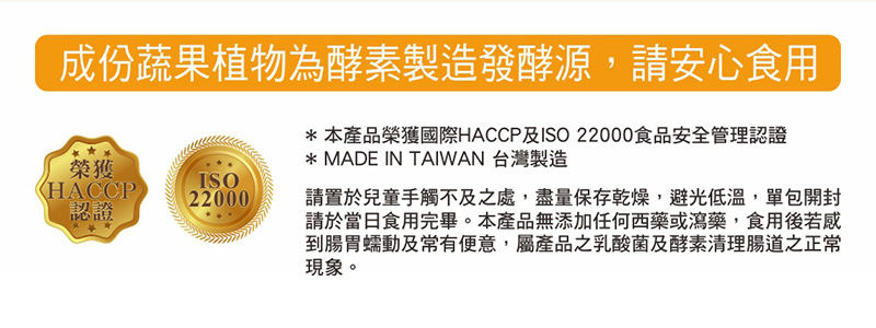 注意事項:請置於兒童無法取得處,持乾燥、無陽光直射處,單包開封請於當日食完畢。本品無添加任何西藥或瀉藥、食用後若感到腸胃蠕動及便意,屬產品之乳酸菌及酵素清理腸道之正常現象,無須擔心。因產品為蔬果植物製成,如有沉澱變色屬自然現象。成分蔬果植物為酵素製造發酵源,請安心食用。