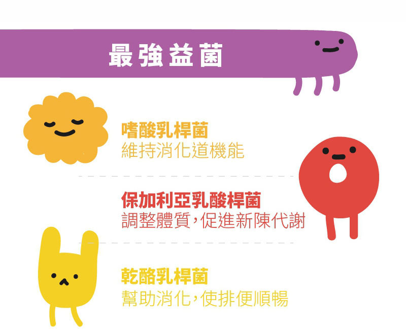 乳醣、果寡糖、植物綜合酵素(麥芽糊精、澱粉分解酵素、蛋白分解酵素、脂肪分解酵素、纖維分解酵素、鳳梨果實、胡蘿蔔、薏苡仁、芡實、紫菜)、蘋果綜合果汁粉(綜合蘋果濃縮汁、麥芽糊精、檸檬酸、香料)、優格果汁粉(乳酸粉、葡萄糖、乳酸香料、優格香料、胡蘿蔔素)、海洋鎂(天然海水礦物質提取)十益菌(雷曼氏乳酸桿菌、副乾酪乳酸桿菌、胚芽乳酸桿菌、嗜乳酸桿菌、唾液乳酸桿菌、龍根菌、發酵乳桿菌、嗜熱鏈球菌、雷特氏乳球菌、比菲德氏菌、脫脂奶粉)、專利香檬汁粉、(香檬汁精萃取粉、麥芽糊精)、專利芭樂葉萃取、甜橙萃取、山竹萃取。