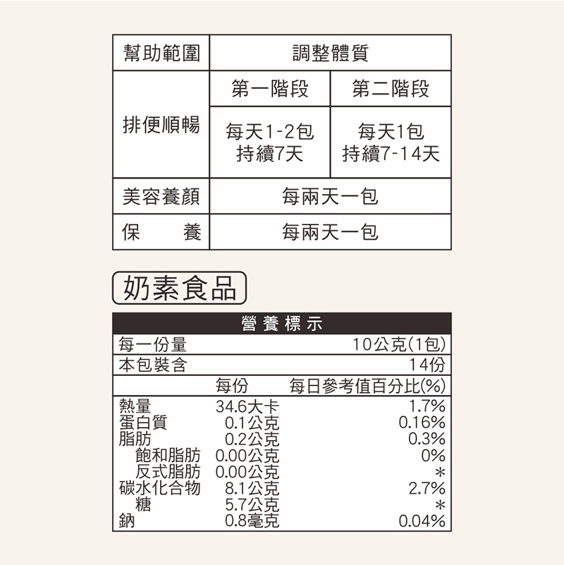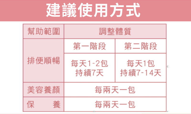 排便順暢:【第一階段】每天1-2包,持續7天。【第二階段】每天1包,持續7-14天