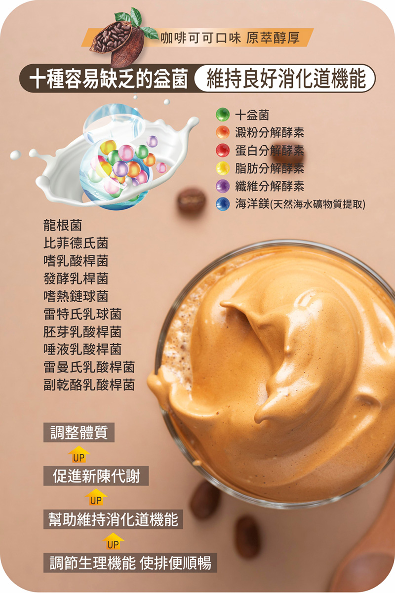 乳醣、果寡糖、植物綜合酵素(麥芽糊精、澱粉分解酵素、蛋白分解酵素、脂肪分解酵素、纖維分解酵素、鳳梨果實、胡蘿蔔、薏苡仁、芡實、紫菜)、咖啡粉(咖啡豆、菊苣[含菊苣纖維])、海洋鎂(天然海水礦物質提取)、十益菌(雷曼氏乳酸桿菌、副乾酪乳酸桿菌、胚芽乳酸桿菌、嗜乳酸桿菌、唾液乳酸桿菌、龍根菌、發酵乳桿菌、嗜熱鏈球菌、雷特氏乳球菌、比菲德氏菌、脫脂奶粉)、可可粉末(砂糖、葡萄糖、可可粉、可可香料)。