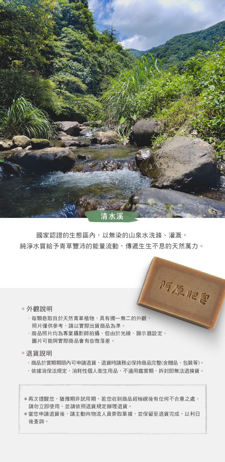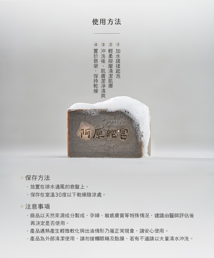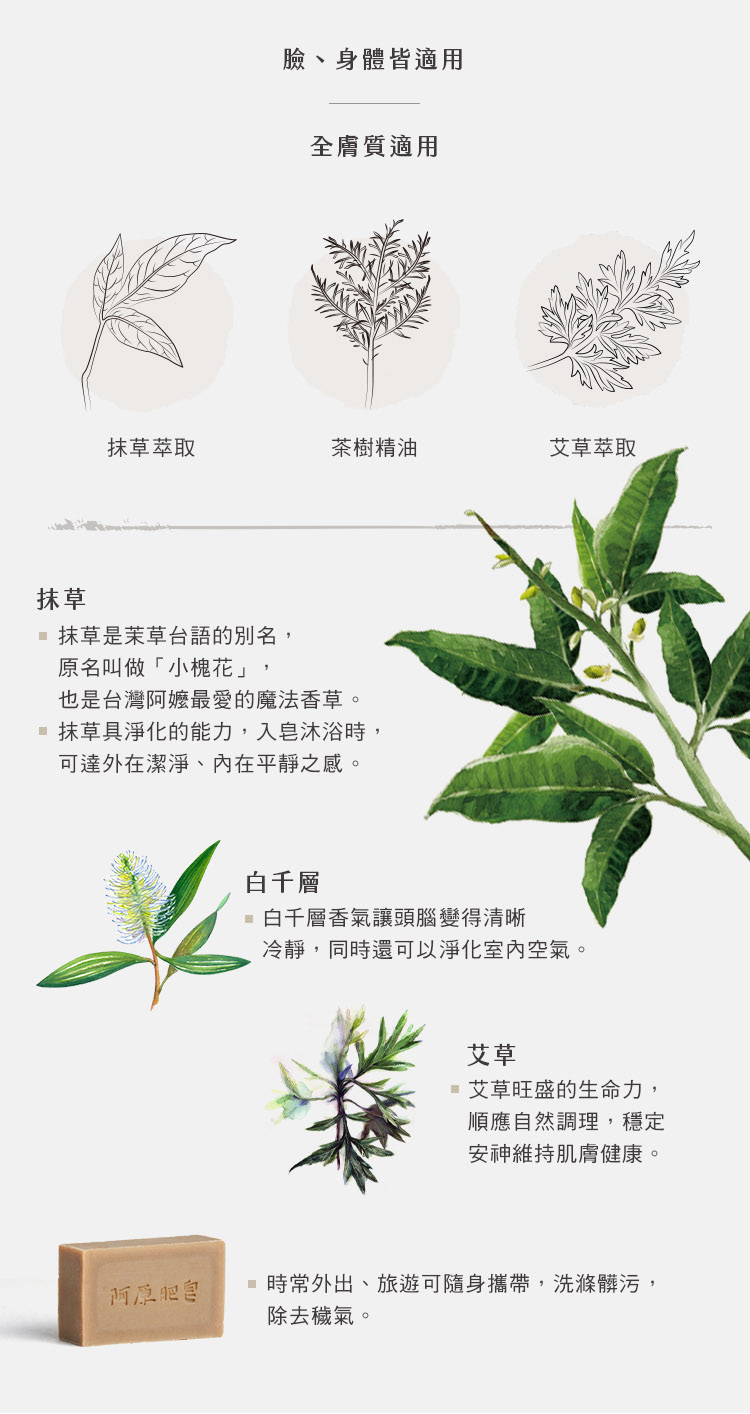 產品名稱 抹草皂 本品含有 椰子油、乳油木果油、橄欖油、抹草萃取、藍膠尤加利精油、白千層精油、有機檸檬草精油、艾草萃取、茶樹精油、馬鞭草萃取、香茅精油 產品淨重 115g 產品尺寸 8.5 x 5 x 3.5 ± 0.5 (cm) 保存期限 三年 產 地 台灣