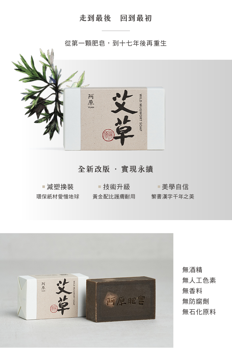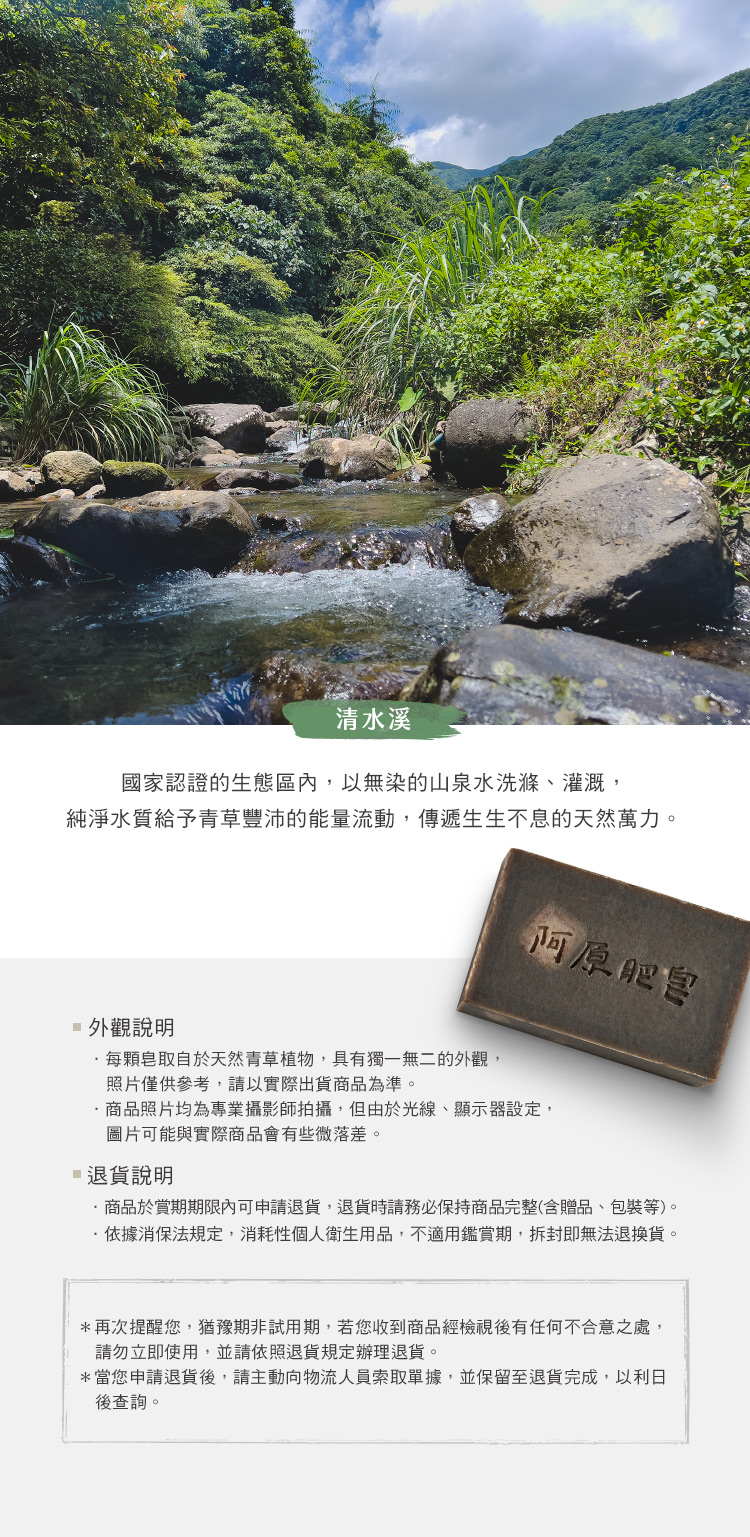 產品名稱 艾草皂 本品含有 椰子油、乳油木果油、橄欖油、艾草萃取、香茅精油、刺檜木精油、馬鞭草萃取、廣藿香精油 產品淨重 115g 產品尺寸 8.5 x 5 x 3.5 ± 0.5 (cm) 保存期限 三年 產 地 台灣