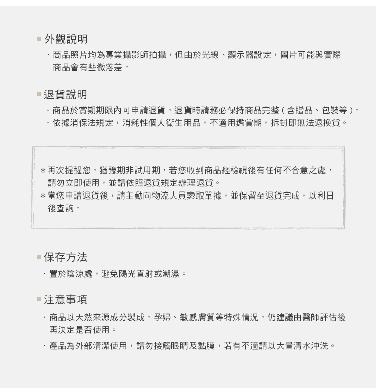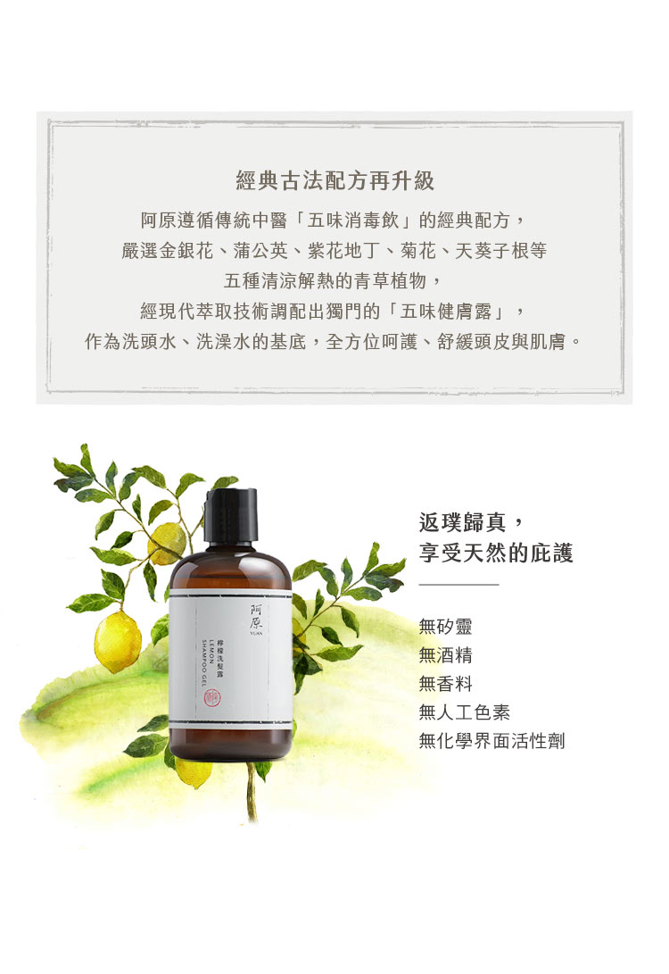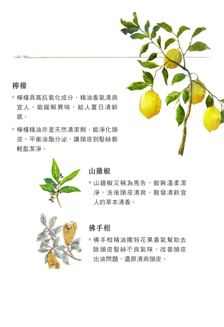 產品名稱 檸檬洗髮露 本品含有 醣基海藻糖,弗來歇氏柳葉菜萃取,白果紫草根萃取,檸檬精油,山雞椒精油,佛手柑精油,有機檸檬草精油,椰子油,荷荷芭油 產品容量 250mL、500mL 產品尺寸 13.5 x 7 、16 x 7.5 ( ± 0.5 cm ) 保存期限 原封三年,開封後六個月內用畢 產 地 台灣