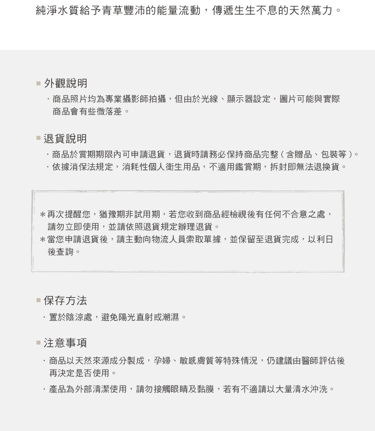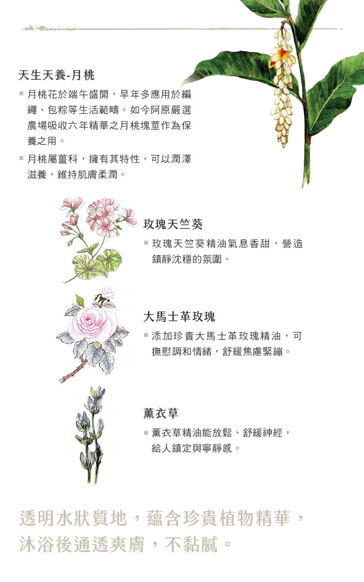 產品名稱 月桃洗澡水 本品含有 月桃萃取,水解大豆蛋白,大馬士革玫瑰精油,玫瑰天竺葵精油,真正薰衣草精油,廣藿香精油,玫瑰草精油, 薑精油 產品容量 500mL 產品尺寸 16 x 7.5 cm ( ± 0.5 cm ) 保存期限 原封三年,開封後六個月內用畢 產 地 台灣